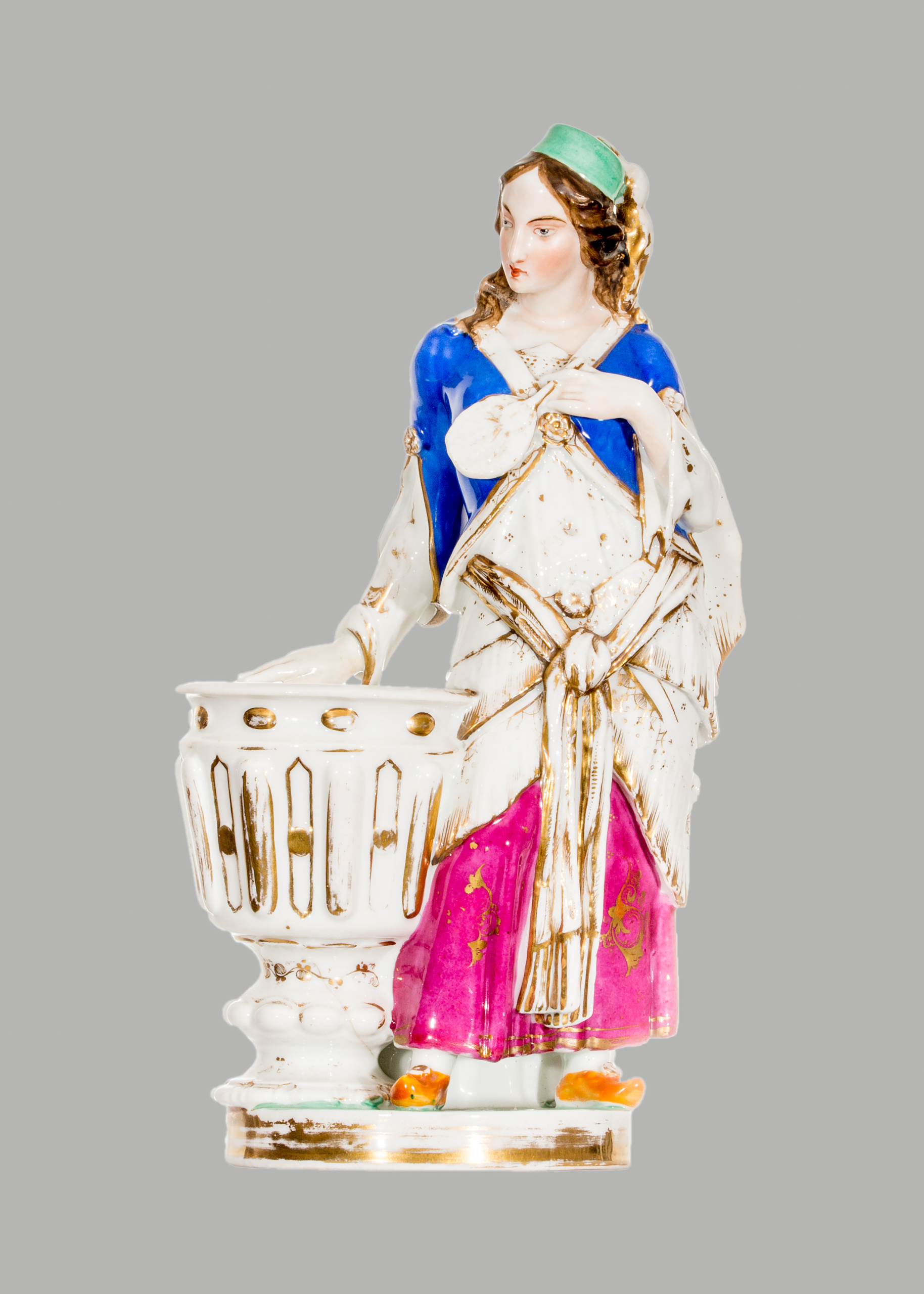 Περιγραφή: Το ένα αγαλματίδιο από ζεύγος γαλλικών πορσελάνινων (Vieux Paris) ολόγλυφων αγαλματιδίων, με μεγάλο δοχείο για καλλυντικά ή για άλλα στερεά ή υγρά αντικείμενα ή και για μελάνι. Παριστάνει μία ολόγλυφη ολόσωμη όρθια Ελληνίδα, με πράσινο φεσάκι στο κεφάλι, επάνω στα πλούσια μαλλιά της, με χρυσαφένια φούντα πίσω. Φοράει μπλε γιλέκο που κουμπώνει μπροστά στο στήθος και από κάτω δύο ανισοϋψή λευκά ενδύματα με χρυσοποίκιλτα στολίδια και φαρδιά ζώνη στη μέση. Από κάτω, διακρίνεται το χρυσοστόλιστο μακρύ βυσσινί φόρεμά της, που αφήνει να φαίνονται τα δυτικότροπα παπούτσια της. Στο αριστερό της χέρι κρατάει καθρέπτη (που βλέπουμε το πίσω του μέρος) ή μικρό ριπίδιο. Με τη δεξιά της παλάμη ακουμπά το χείλος μεγάλου ευρύστομου και υψηλού δοχείου με πόδι, ανάγλυφο και επίχρυσο διάκοσμο, χωρίς κάλυμμα. Η βάση, απλή στρογγυλή με πράσινη διακόσμηση και χρυσή περίμετρο. Κάτω από τη βάση, εμπίεστη η ένδειξη: Bomine ή Bonune.